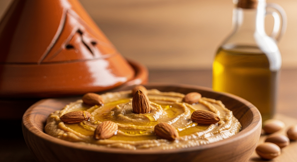 • Amlou ist ein traditioneller marokkanischer Brotaufstrich aus Mandeln, Arganöl und Honig.