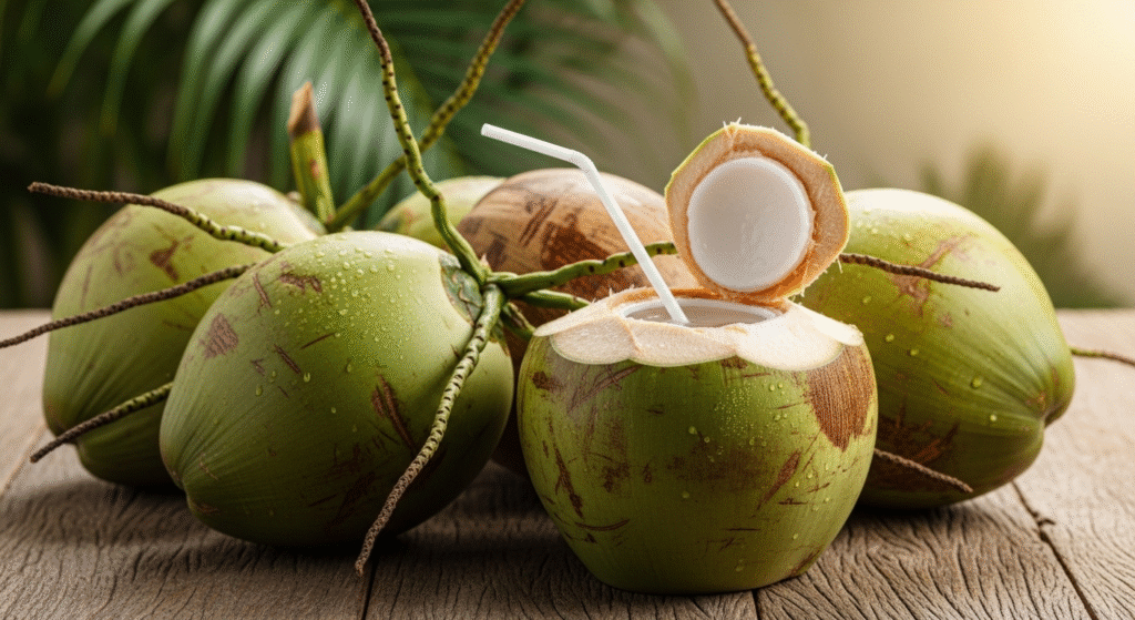 • Junge, grüne Kokosnüsse: Diese sind ideal für Kokosnusswasser. Ihre Schale sollte intakt, glatt und grün sein. Leichte Verfärbungen oder kleine braune Flecken sind normal, aber vermeiden Sie Kokosnüsse mit großen, weichen, matschigen oder schimmeligen Stellen. Die “Augen” am oberen Ende sollten fest und trocken sein.